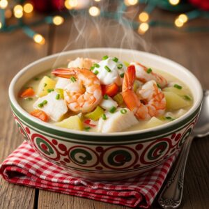 A rich, luxurious chowder loaded with shrimp, white fish, and potatoes—a festive seafood treat.