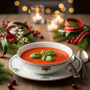 Classic tomato soup elevated with fresh basil—bright red and perfect for Christmas colors.