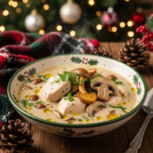 A rich blend of chicken, mushrooms, and herbs—comforting and festive.