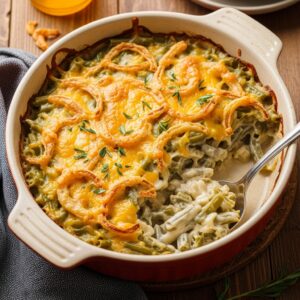Nothing says holiday comfort like a warm, creamy green bean casserole. This timeless dish combines tender green beans, rich mushroom sauce, melted cheese, and crispy fried onions for the perfect balance of creamy and crunchy. Whether it’s Thanksgiving, Christmas, or a cozy weeknight dinner, this casserole is always a crowd-pleaser.